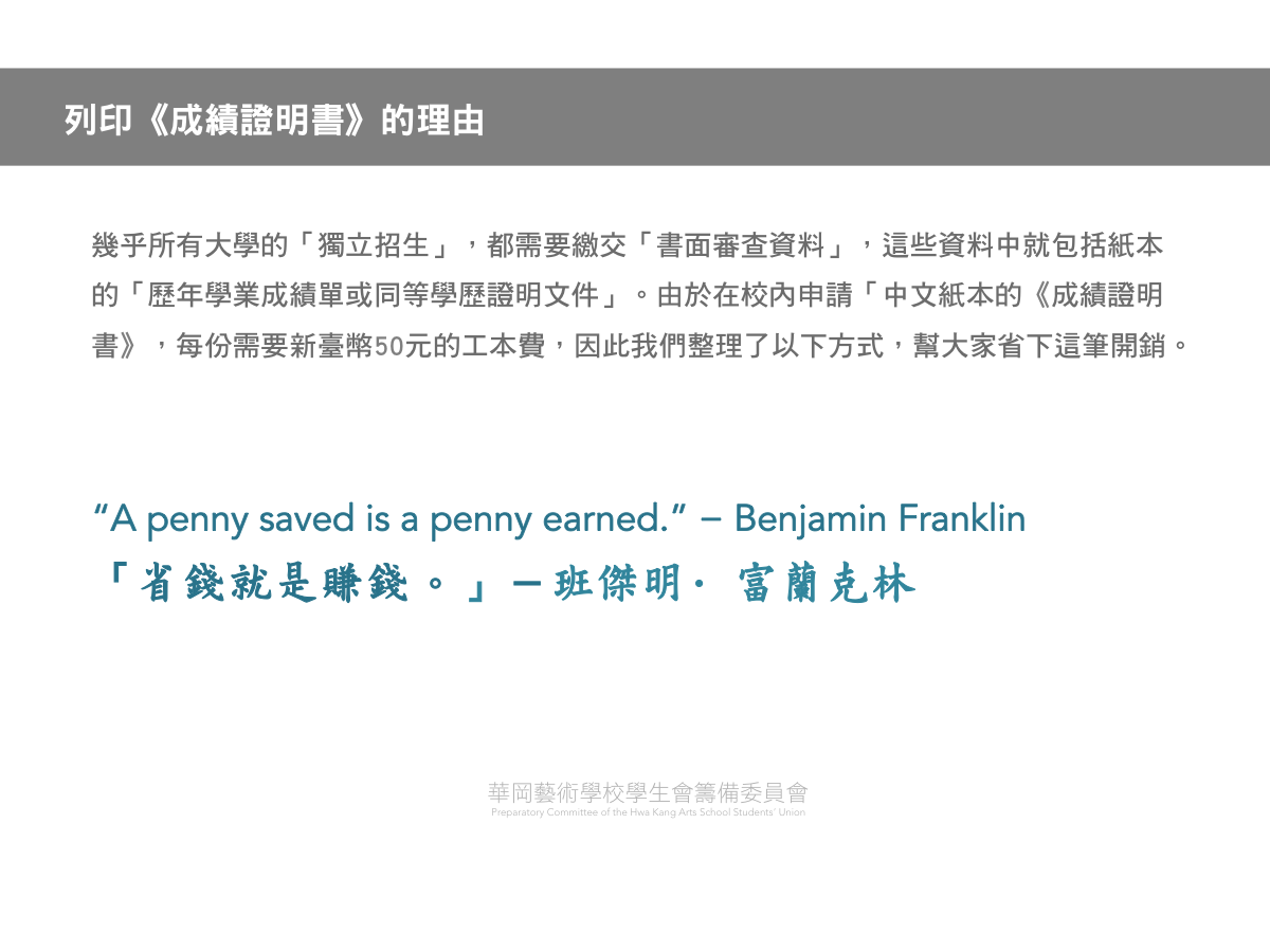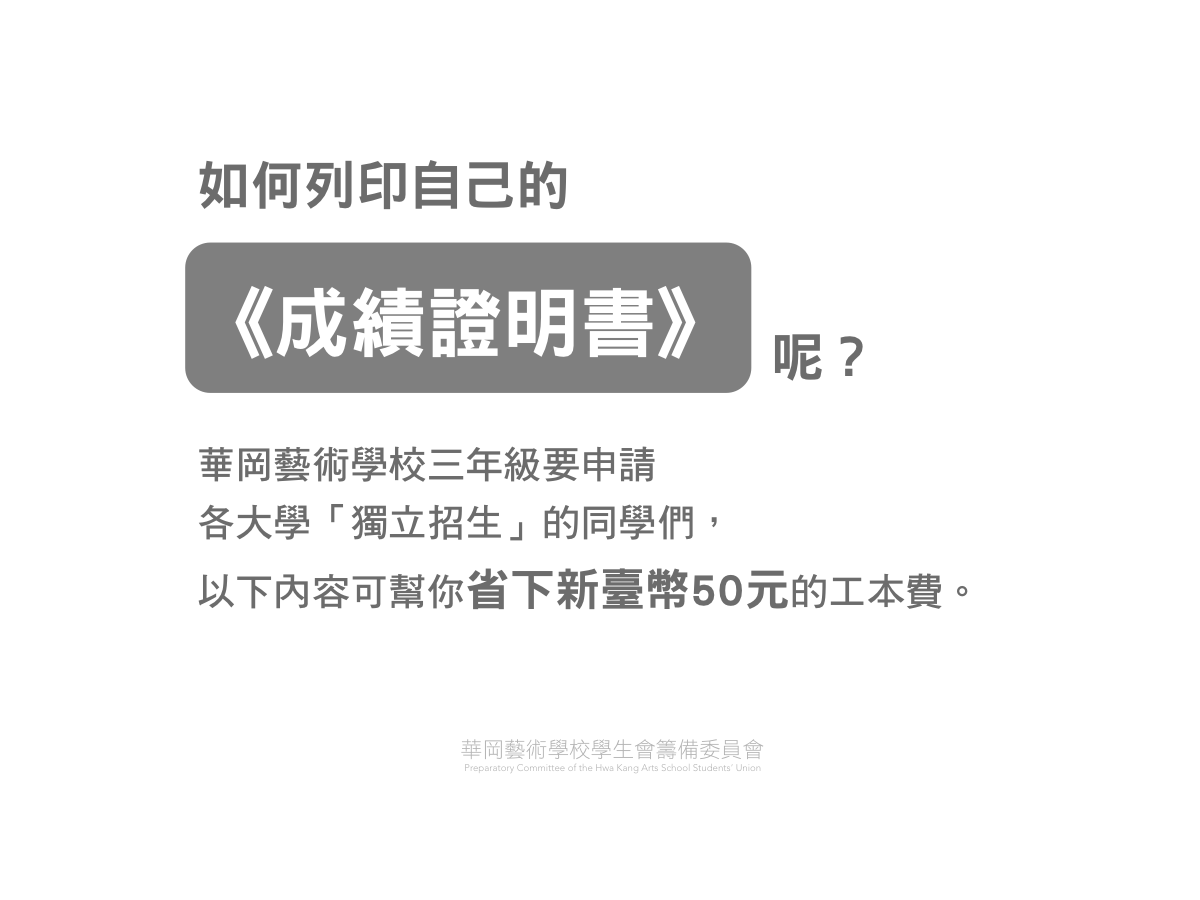 自《大學入學考試中心105學年度學科能力測驗考生成績通知單》發放後,部分大學的「獨立招生」也如火如荼地展開著。由於這些提供「獨立招生」的大學在書面審查資料上,幾乎都需要紙本的「歷年學業成績單」。為了幫大家省下在校內申請中文紙本《成績證明書》的新臺幣50元工本費,我們特別為大家製作17張圖卡,用簡潔的文字與圖像進行說明,希望能以此幫助需要升學的三年級同學們。