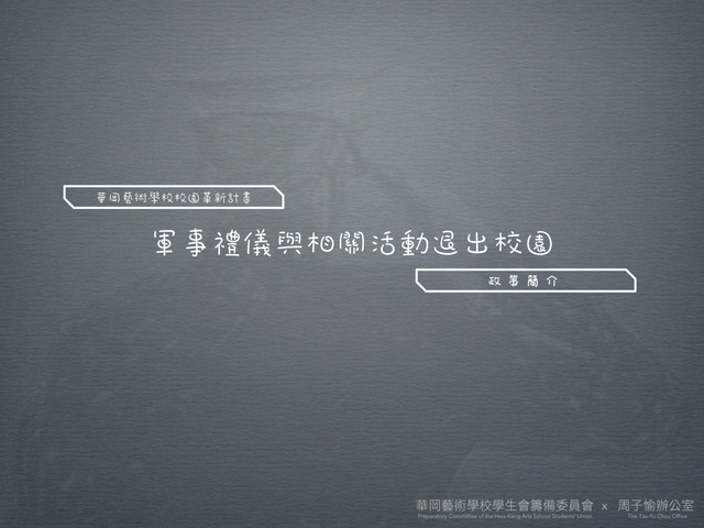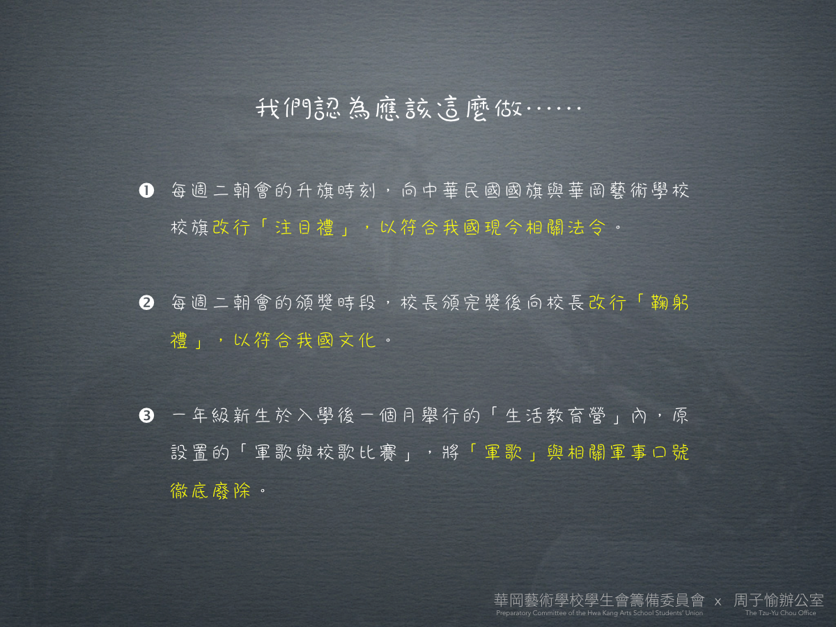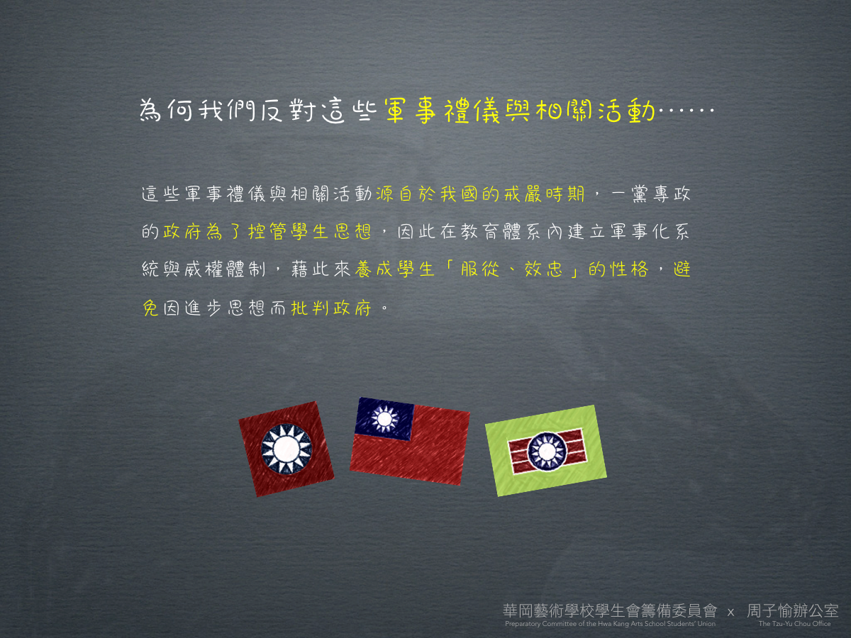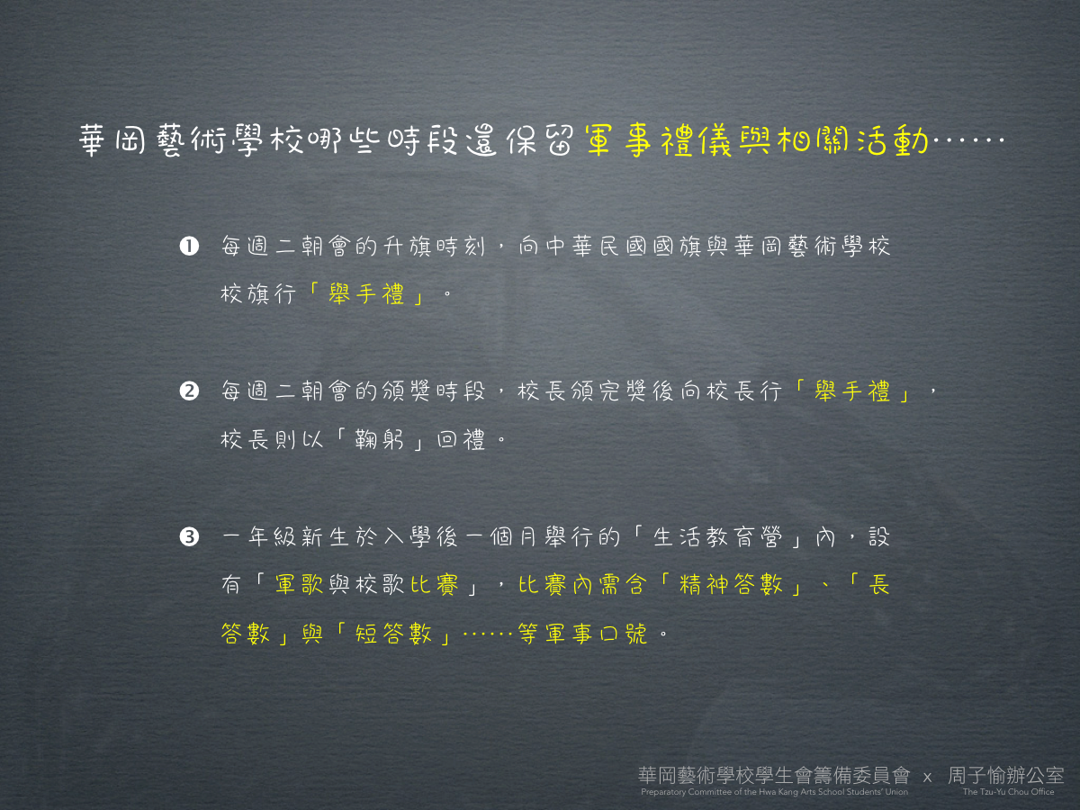 本會籌備委員會現任主席周子愉近日已開始積極推動先前提出的「《華岡藝術學校校園革新計畫》首部曲」的政策/政見,自日前宣布先行推動「〈更換音樂電腦剪輯教室iMac與《Logic Pro》〉」後,今再行推動「軍事禮儀與相關活動退出校園」。為了讓校內同學與社會大眾能更清楚了解此項政策/政見推動的必要性,特別製作5張圖卡,用簡潔的文字與圖像進行說明。
